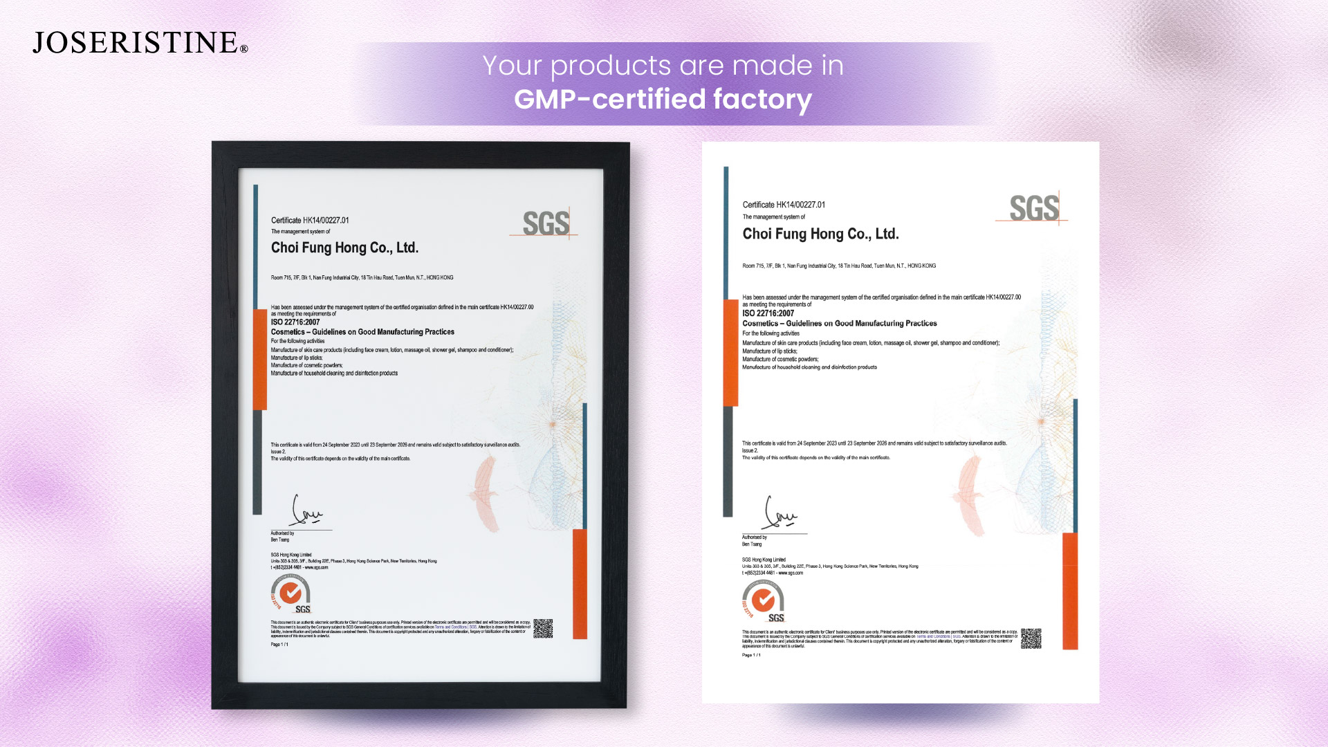 Choi Fung is the first personal care and skincare manufacturing facility in Hong Kong accredited by SGS for GMP and certified for ISO 9001 and ISO 22716:2007. Since its establishment in 1995, the company has built a strong reputation and owns multiple well-known in-house brands, including Joseristine and JimmBENNY. Today, Choi Fung operates 32 retail stores across Hong Kong.